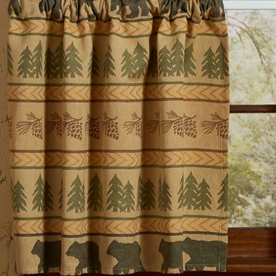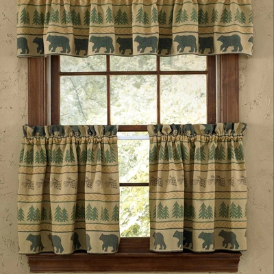 - The Bear Tracks Lined Tiers features black bears and green pines in a jacquard weave bringing the outdoors into your home. A great addition to your window that offers a rustic cabin charm.
