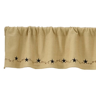 Add a rustic charm to your farmhouse decor with this embroidered valance curtain. The burlap material and beautifully embroidered stars combine to create a unique country window treatment that will instantly enhance the surrounding space. The lined beige fabric provides a slight filter that lightly blurs the harsh sunlight into a softened, warm tint.