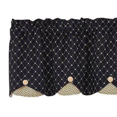 Gorgeous wall addition to any country farmhouse style! This antique window treatment in beige and black hues features a traditional star pattern with beautiful button details to create a scalloped element. Perfect to use throughout the year, this valance creates a warm and inviting aura to the desired room in your home. You will quickly fall in love with the classic appeal this window treatment adds to your everyday home decor with its timeless design