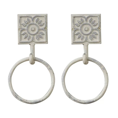 - This casual farmhouse inspired set of 2 Distressed Tile Ring Hooks are suitable for your master or guest bathrooms. They give you a place to hang your towels and accessories to keep your home clean and clutter-free!