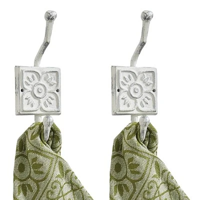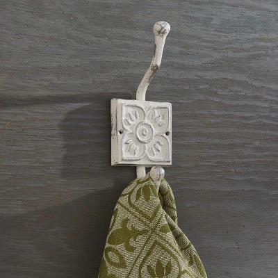 A decorative metal single hook that features an embossed pattern and provides an attractive solution for your storage needs. The simple design includes a delicate whitewashed motif and generously sized hook that is perfect for hats, handbags, umbrellas, towels, clothing and much more. This rustic wall organizer will coordinate well with many home decor trend like country, farmhouse, cottage and more. Makes for an excellent gift for birthday, wedding, anniversary and especially housewarming!