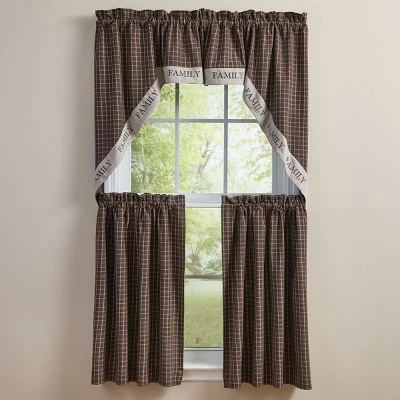 Grace your space with a touch of traditional charm! This pair of patterned swag valance curtains have a classic grid plaid design with an embroidered ‘family’ quote border that elegantly incorporates a country color palette in rustic brown and cream hues. Features unlined fabric and natural ruffling with delicately draped sides to offer a timeless look without having to redecorate an entire room. Can be used by itself or paired with your favorite tier or curtain panel for a unique and dynamic wall display. This window treatment can be used time and time again in your favorite farmhouse, country, and primitive room decor.