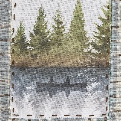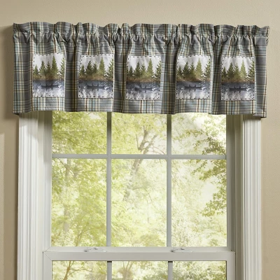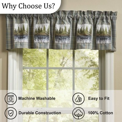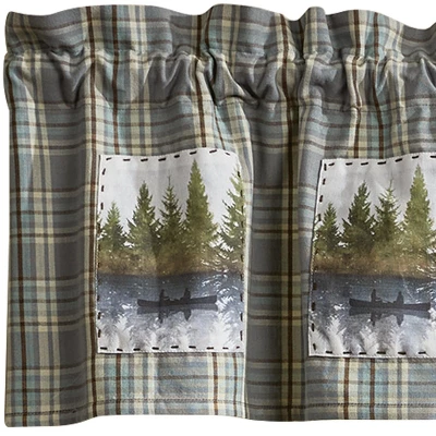 Capture the still, serene atmosphere of lake life with this nature patterned valance curtain. Features a rustic plaid fabric accented by decorative patches of a foggy forest landscape and a scenic reflective lake view with two fishermen in a canoe lined by towering pine trees. Lined with cotton fabric to provide a filter to harsh outdoor lighting and sense of privacy. Accented by delicate ruffling at the top to offer a timeless look without having to redecorate an entire room that can be used by itself or paired with your favorite tier curtain for a dynamic display. This rustic outdoorsy window topper can be used time and time again in your favorite farmhouse, country, lodge, lake house, primitive, cabin home decor, and more.