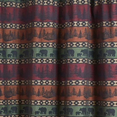 Create a cozy, mountain inspired retreat with these rustic tier curtains that will amplify any bathroom space. Features a wilderness pattern with bears, trees, and a lodge cabin in a rustic inspired woven jacquard design. To display in a shower or bath setting, simply hang on a rod with shower curtain hooks from the 12 sewn in ring holes.