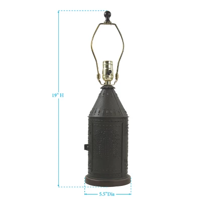 This is a lamp replica of a New England punched tin original with the adaptation of a willow tree design. This black lantern is one that was said to be carried by Paul Revere the night of his famous ride in 1775. The tabletop lamp features a three-way switch so that you can select and change the level of brightness as desired, and a night light that can be on in addition to the lamp or as an alternative. A beautiful and timeless addition to home decor.