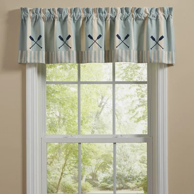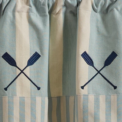 Uplift your living space by introducing a lakeside patterned valence. This lined window accessory features boat paddles against a blue and cream stripe background. Introduce this beautiful piece to your space to invite a fresh look without having to redecorate the entire room.