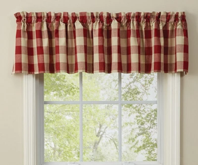 A beautiful mix of jeweled red and tan blend seamlessly together to create an oversized buffalo check. The traditional country look on this window treatment is warm and inviting that will provide a beautiful colorful accessory to your window. The valance is unlined so that light can filter through which softens a room making it more welcoming and comfortable.
